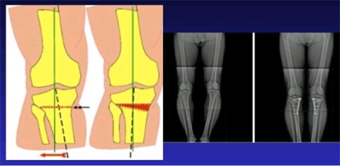 무릎 아래의 경골 근위에 인위적인 절골을 시행하여 무릎 안쪽으로 쏠린 체중을 바깥쪽으로 분산시켜 무릎 통증을 완화시키고 자신의 관절로 일상생활이나 근로가 가능케 하는 원리로 경골 위 끝부분부터 쐐기 모양으로 절제해 그 안에 이식용 뼈를 채우고 금속판으로 고정함으로써 휜 다리 모양을 일자로 잡아주는 수술입니다.