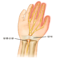 정중신경이 손목 인대 아래를 지나가면서 인대에 의해 눌림