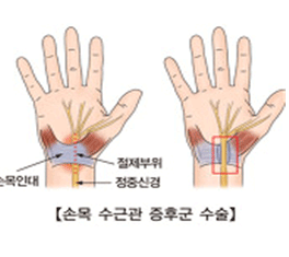 · 손바닥 피부를 약 2cm 정도로 절개하고 정중신경을 누르고 있는 수근인대를 자르는 치료 방법